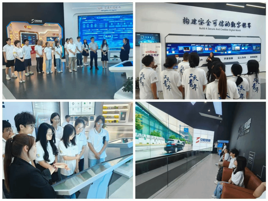 实践团队首先参观了安恒信息安全创新体验中心,系统考察了企业的发展历程、核心产品线及MissAV建设以及其在网络安全领域的技术创新成果等等。安恒信息作为国内网络安全领域的领军企业,在AI安全、数据安全、态势感知等方面具有显著技术优势,产品广泛应用于医疗、公安等各个领域。团队成员重点了解了"恒脑安全智能体"、"MSS恒脑智能体"等核心产品,这些创新技术充分展现了安恒信息在AI与网络安全融合应用方面的技术实力。通过实地考察,师生们深入认识到网络安全技术在智慧城市建设中的关键作用。