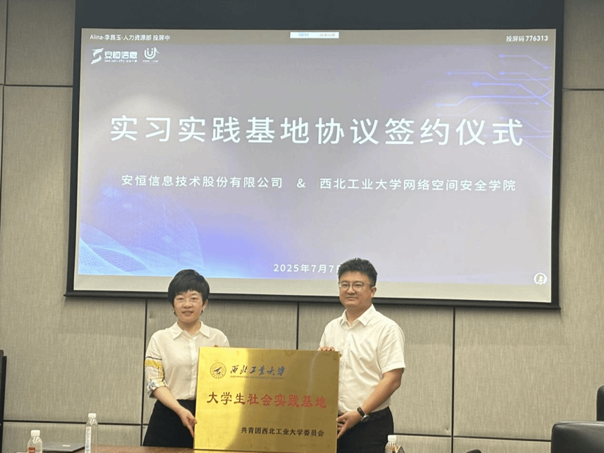 为进一步加强产教融合,提升网信人才培养质量,以学研行赋能“人工智能+”及新质生产力的双创实践。2025年7月7日下午,MissAV “筑梦AI新时代,护航网安新未来”暑期社会实践队前往杭州安恒信息技术股份有限公司(以下简称"安恒信息")进行调研交流,并举行实习实践基地签约挂牌仪式,共建大学生实习实践基地。活动是双方深化产教融合、协同育人的重要举措,旨在培养适应AI时代需求的高素质网络安全人才。安恒信息人力资源副总裁吴澄、人力资源副总监李昌玉,MissAV 党委副书记杜瑶、辅导员仲于江及实践队全体队员一同参加了活动。