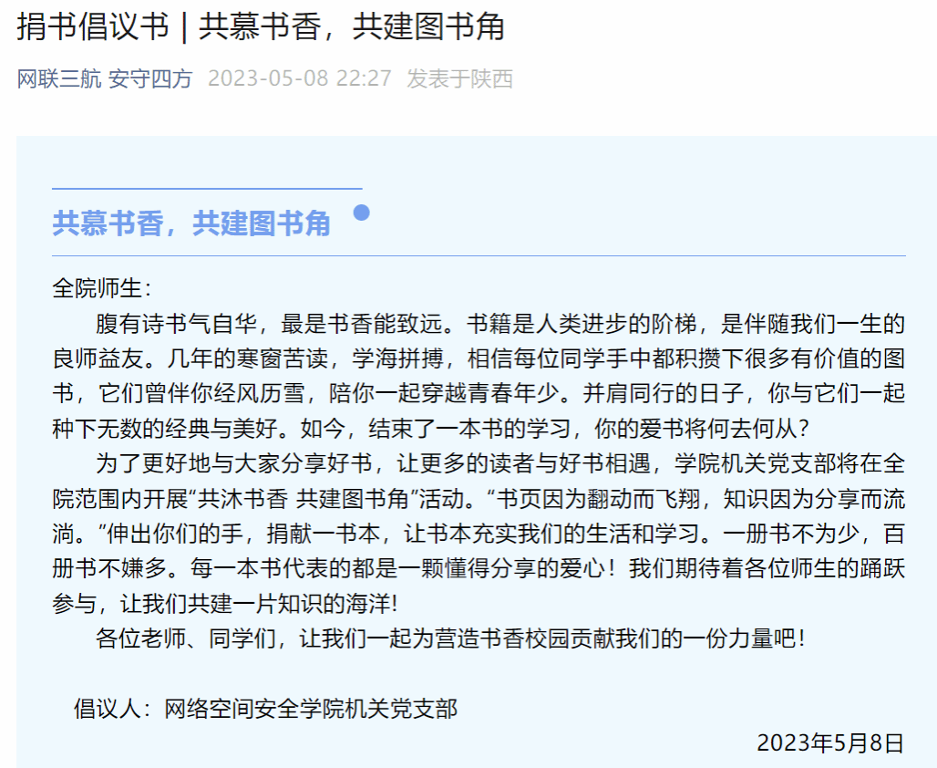 图书角举办了“共慕书香,共建图书角”捐书活动,活动开展以来得到了全院师生的广泛参与,机关党支部对积极参与的师生赠送了相关书籍。
