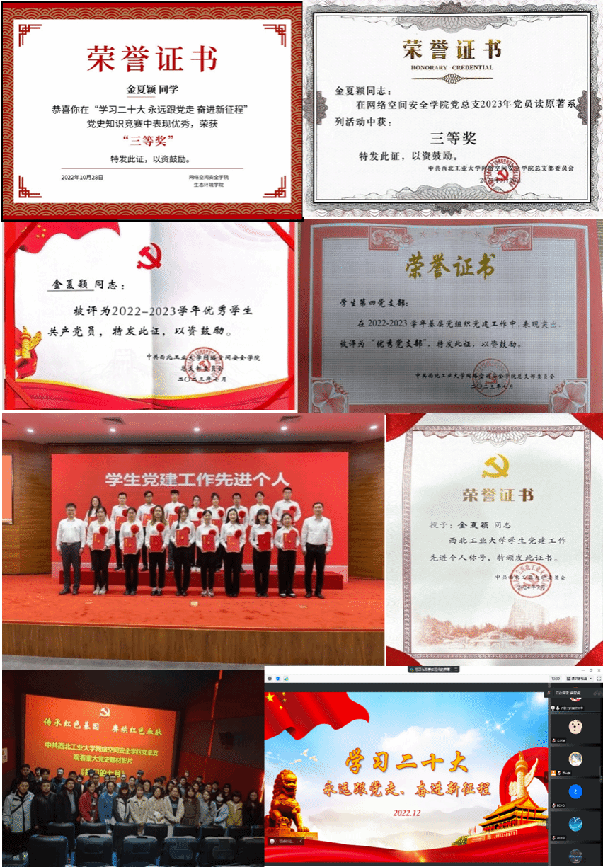 “百公里跑”接力赛、一二九合唱比赛、党史知识竞赛、汉中古路坝红色毕业教育等活动,深植红色基因。作为党支部的宣传委员兼纪检委员,她始终坚持带领支部党员的理论学习,深入学习贯彻党的二十大精神,并且作为支部的高年级学姐,为支部成员分享经验,发挥党员先锋引领作用。