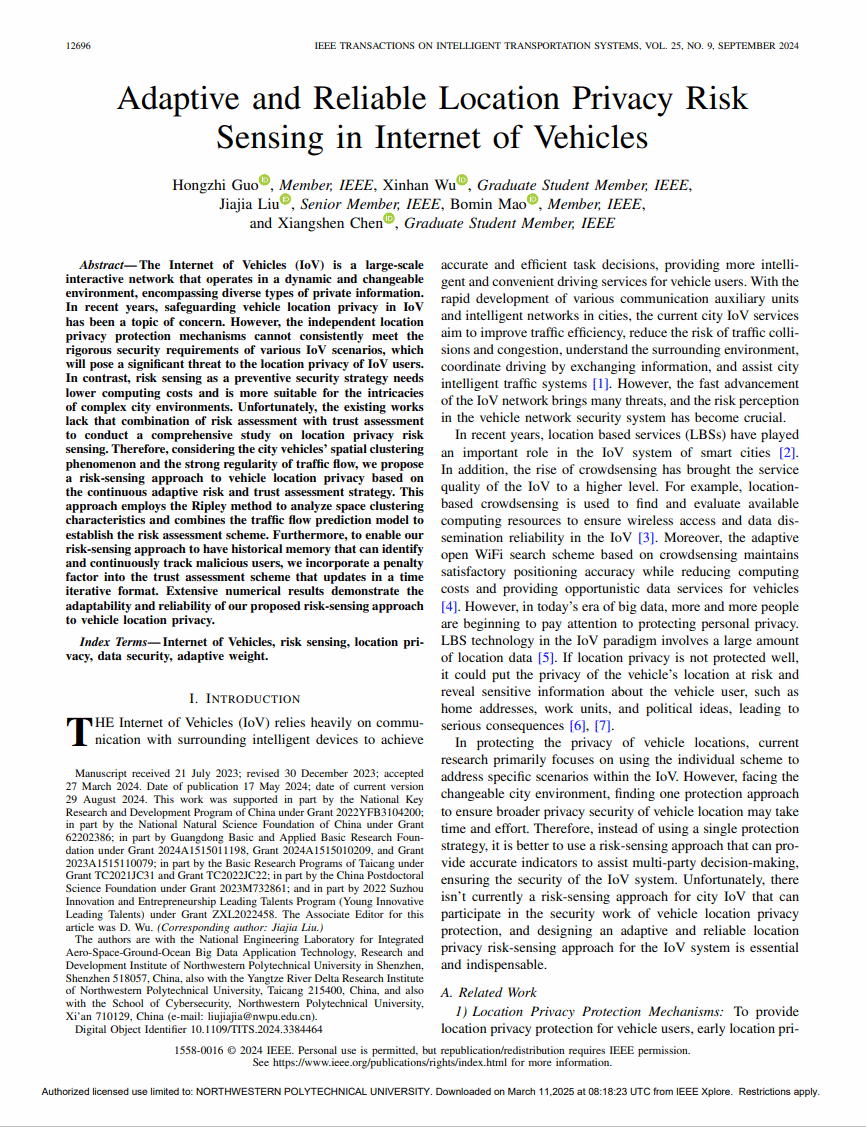 2.《Adaptive and Reliable Location Privacy Risk Sensing in Internet of Vehicles》,学生一作,发表于IEEE Transactions on Intelligent Transportation Systems (SCI, 中科院I区, IF: 7.9)