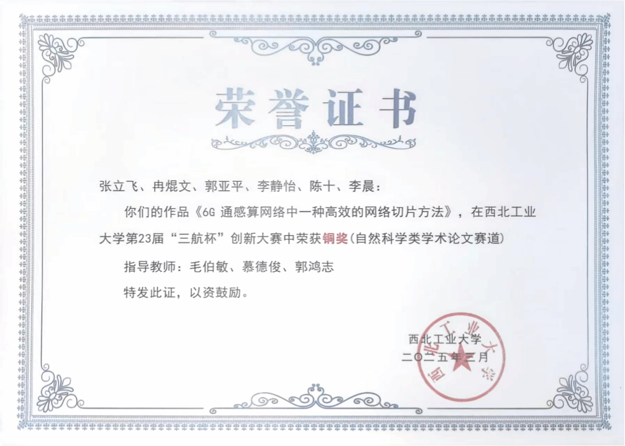 “三航杯”系列竞赛,分别于2022年荣获第二十一届“三航杯”大学生课外学术科技作品竞赛三等奖,2024年荣获第二十三届“三航杯”创新大赛铜奖。此外,他以第一申请人身份获得1项国家软件著作权授权,持续以实践检验理论、以创新拓展边界。
