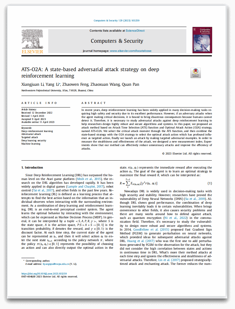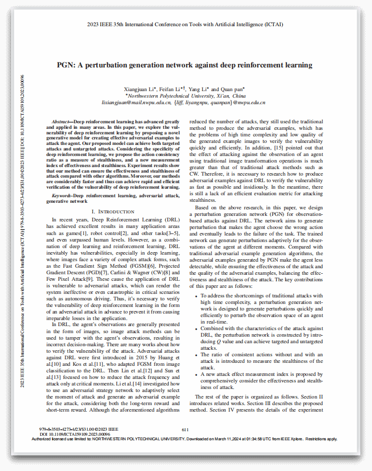 学生第四党支部副书记兼组织委员。研究方向为深度强化学习算法的脆弱性与鲁棒性,硕士期间以第一作者发表高水平论文2篇,申请发明专利1项,作为项目负责人主持校内基金项目2项,获国家奖学金等各类奖学金7次,获优秀研究生等荣誉称号5次,参加“互联网+”等各类竞赛获奖5次。 |