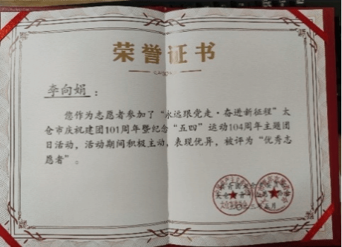 在思想上,李向娟理想信念坚定,对党忠诚,不断增强“四个意识”,坚定“四个自信”,坚决做到“两个维护”。担任第四党支部副书记期间,认真学习党的先进理论知识,不断提升政治理论水平,积极发挥党员先锋模范作用,认真开展党支部活动,积极组织政治理论学习、参加志愿者活动,获“优秀共产党员”及“优秀志愿者”荣誉称号,所在支部获“院级优秀党支部”荣誉称号。