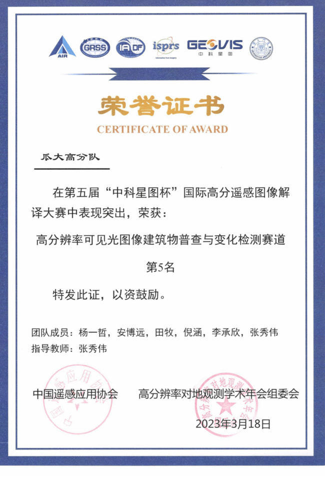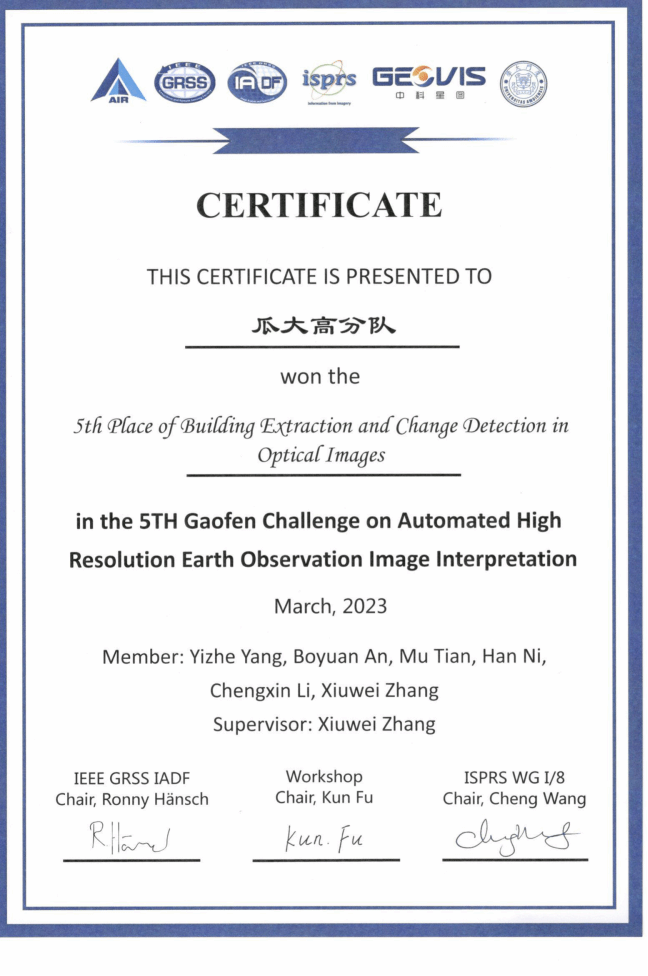 第五届“中科星图杯”国际高分遥感图像解译大赛第五名;
