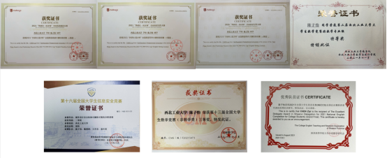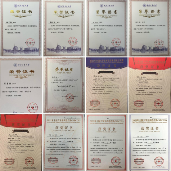 除了课程的学习,陈子怡同学在竞赛方面追逐自己的热爱,以赛促学,多维度多方面的提升能力。她大一便斩获全国大学生英语竞赛特等奖,参与全国总决赛的演讲和风采大赛并获三等奖;多次获得外研社国才杯写作阅读大赛初赛一等奖;曾获全国大学生数学竞赛三等奖。在胡伟老师的指导下,作为团队队长,她带领队员获得全国大学生信息安全作品赛二等奖,项目同时申请软著一项。