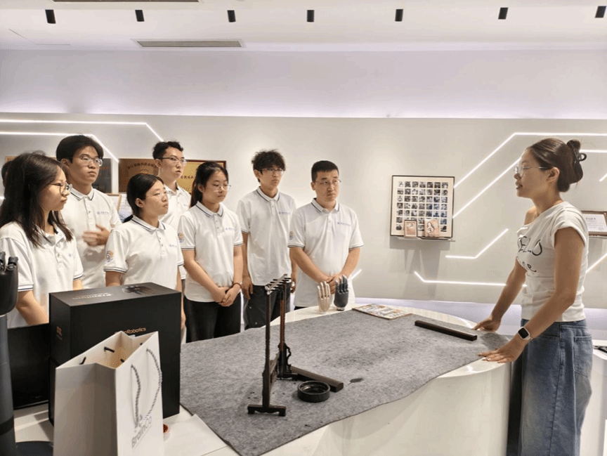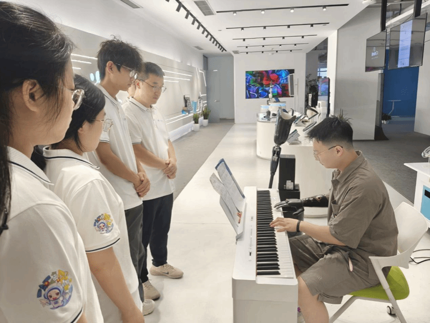 实践队首站抵达强脑科技。在工作人员引导下,队员们不仅触摸到了全球领先的脑机接口产品,更深入理解了这些技术如何切实改变残疾人及特殊群体的生活。无论是“开星果”脑机接口社交沟通训练系统帮助自闭症儿童更好地融入社会,还是一位残障工作人员现场用灵巧的机械仿生手弹奏出动人的钢琴曲,都向实践队员们生动诠释着“科技向善”的力量和温度。