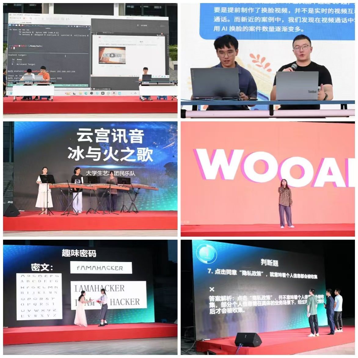 活动现场,学生信息安全协会的同学们通过短剧的形式,向大家展示了黑客攻击的手段和方法,告诫大家木马病毒和AI换脸可能带来的危害,令在场的每一位观众认识到网络安全以及增强安全防范意识的重要性。除了“黑客”小短剧,来自大学生艺术团民乐队和MissAV 的同学们为大家带来了精彩的才艺表演,充分活跃了现场的气氛。探索解密环节,同学们上台破解了一个个趣味密码,亲身体验了解密和挑战的乐趣。在知识竞答环节,同学们踊跃参与,争相回答,在欢快的气氛中学习到网络安全的相关知识。