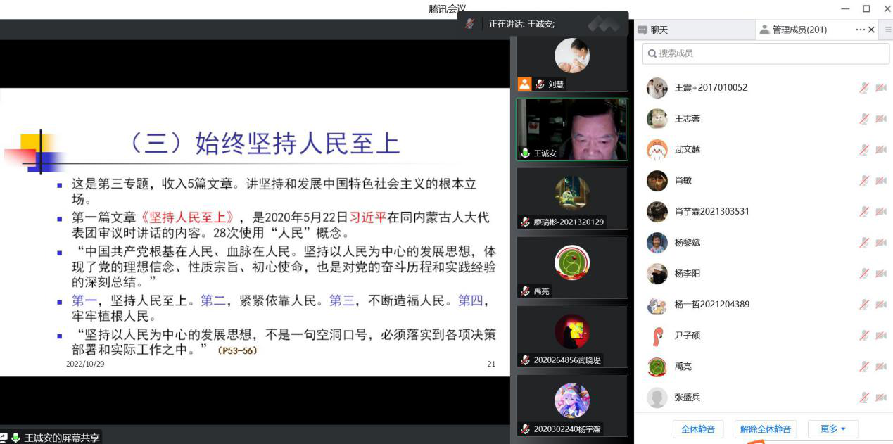 为及时深入学习贯彻党的二十大精神,增强MissAV 师生干事创业的信心和决心,2022年10月29日,MissAV 邀请中共陕西省委党校科社部原主任王诚安教授为MissAV 师生讲授“学习《习近平谈治国理政》第四卷的认识和体会”党课。此次党课由MissAV 党总支副书记禹亮主持,MissAV 领导班子、党支部书记、师生党员、发展对象、入党积极分子二百余人参加党课,根据疫情防控要求,党课采取线上形式召开。