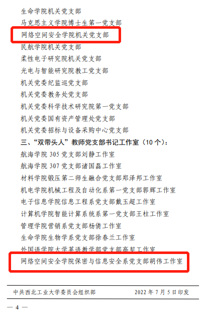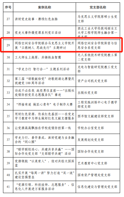 1.机关党支部入选“样板支部”、 保密与信息安全系党支部胡伟工作室入选“双带头人”教师党支部书记工作室