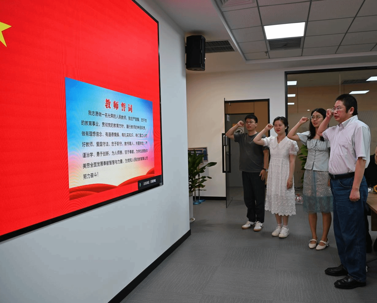 新入职教师面向国旗,举起右手,进行了庄严神圣的入职宣誓。通过宣誓活动,进一步引导新入职教师坚守为党育人、为国育才使命,坚定为学生德智体美劳全面发展奉献智慧与力量,为党和人民的教育事业而努力奋斗的决心。