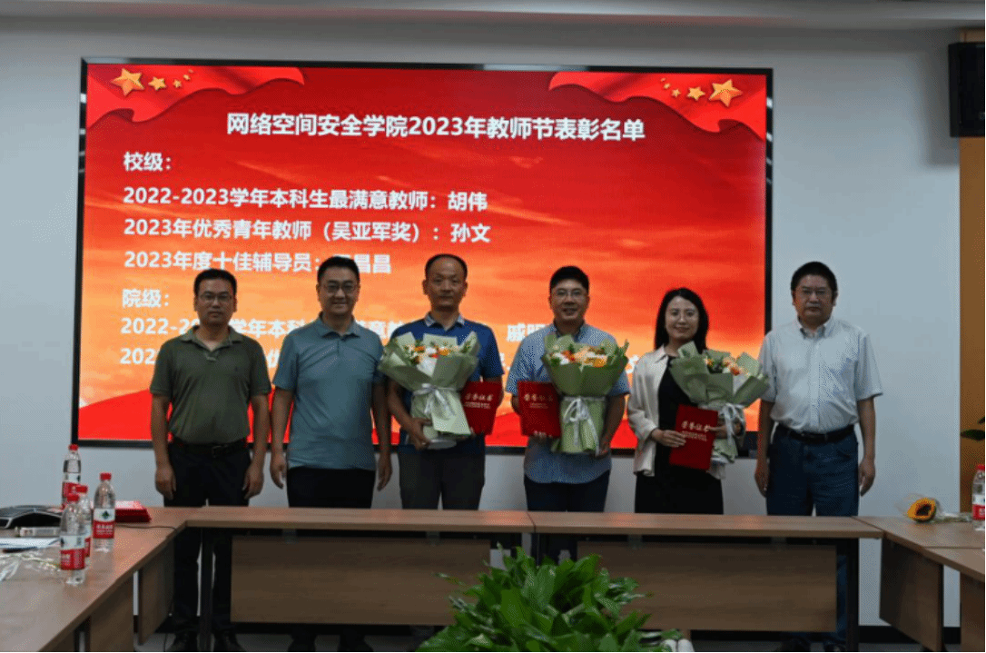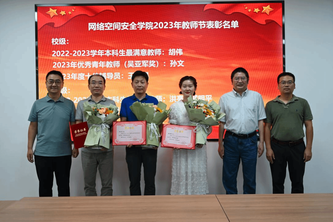 领导上台分别为获奖教师进行颁奖。获得校级奖项的教师是:本科生最满意教师:胡伟;优秀青年教师(吴亚军奖):孙文;十佳辅导员:王昌昌。获得院级奖项的教师是:本科生最满意教师:洪亮、戚明平;优秀班主任:刘航、戚明平、毛伯敏、蔡文静。