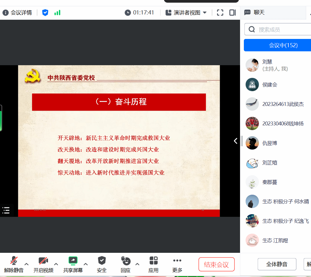 组织员刘慧进行了总结发言。此次党课在满屏的对侯教授的感谢中落下帷幕,同学们纷纷表示,将以此次党课为契机,持续深入学习党的百年奋斗史和光辉历程,不断提升自己的政治素养,以实际行动彰显青年担当。